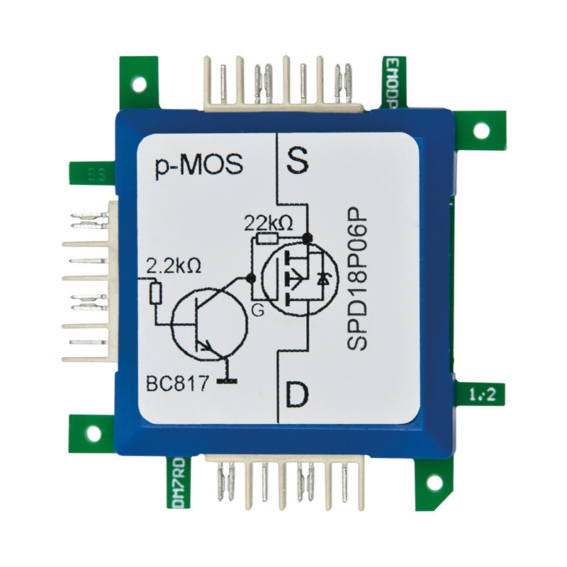 Tranzistor P-MOS s předřadníkovým tranzistorem BC 817. Pomocí předřadníkového tranzistoru lze řídit 0-5V PWM nebo signál ON/OFF přímo s detektorem pohybu. Výkonové údaje tranzistoru P-MOS: maximální napětí 60 V 18 A. Lze provozovat v cihlovém systému s maximálním proudem 12A (kontakty max. 6A na kontakt). Upozornění: malá chladicí plocha v cihle, ochrana proti tepelnému přetížení.