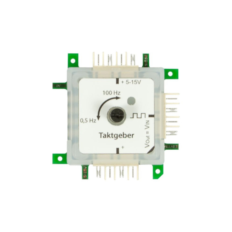 kostka generátoru hodin slouží jako zdroj hodin pro logické kostky. Obvod je založen na univerzální časovací cihle 555. Pomocí potenciometru lze nastavit signál se čtvercovou vlnou v rozsahu přibližně 0,5 Hz až 100 Hz. Pro generování jednotlivých impulsů ve tvaru čtvercové vlny lze generátor hodin vyměnit 1:1 za kostku "Button debounced" (ALL-BRICK-0641). Napájecí napětí: +5..15 V.