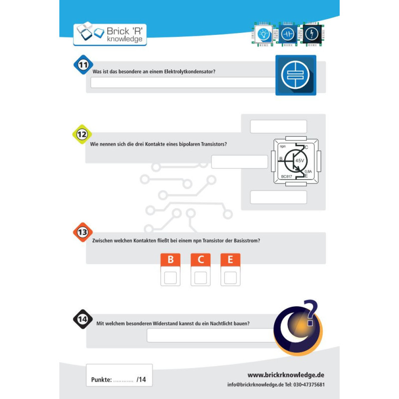 Jedná se o sešit s cvičeními a opakováním pro žáky a studenty, který vychází z informací v příručce Basic Set. Pomocí tohoto sešitu si lze přehlednou a hravou formou vyzkoušet naučené obvody, součástky, jednotky a elektronické zákonitosti. Tento článek obsahuje 10 tištěných cvičebnic, které jsou zasílány v cihlovém sáčku. Cvičebnici si můžete také zdarma stáhnout ve formátu PDF z webových stránek www.brickrknowledge.de.