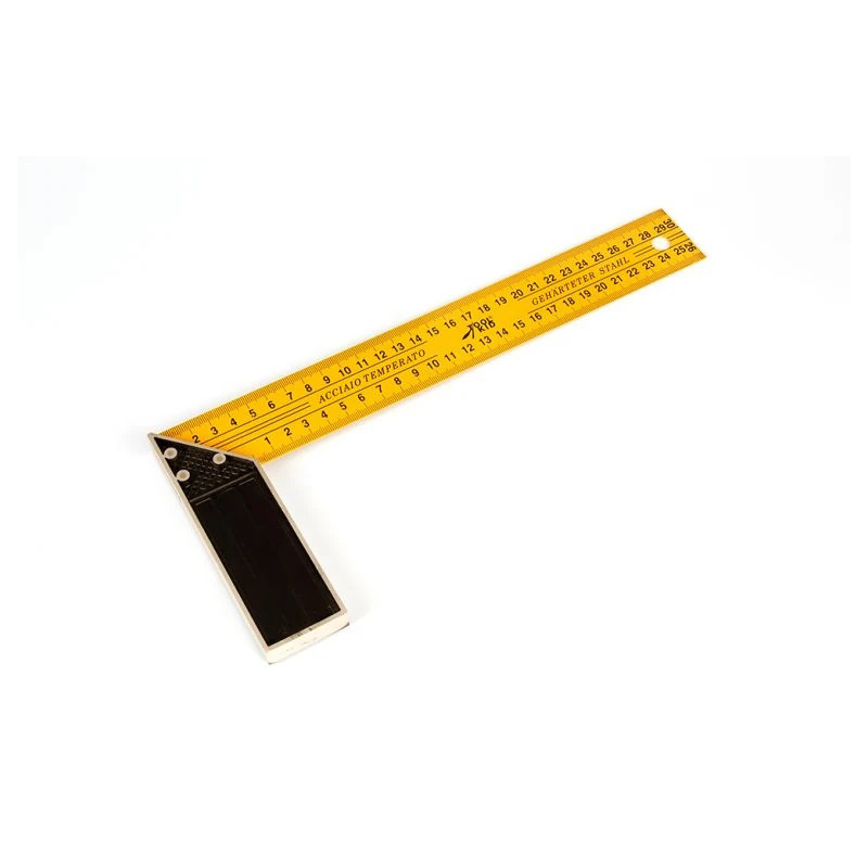 Tesařský čtverec se používá k měření a značení kolmých čar, například pokud chcete řezat prkno nebo desku v pravém úhlu. Můžete jej také použít ke kontrole, zda je úhel kolmý. Tesařský čtverec je robustní, pevný a drží tvar. Pravítko je dlouhé 30 cm a udává centimetry a milimetry.