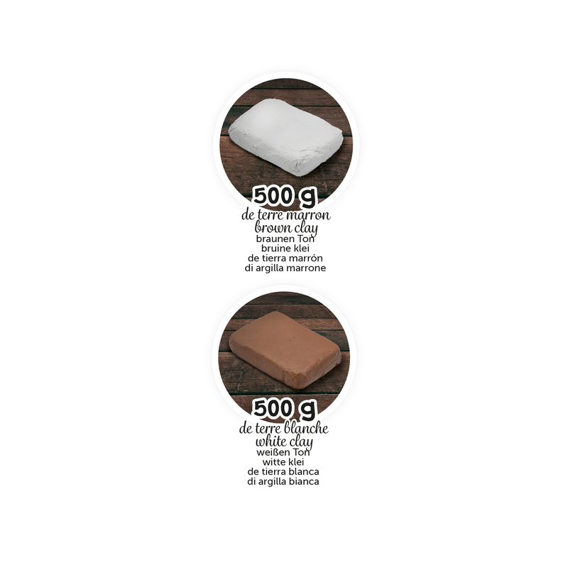 Sada obsahuje 2x 0,5kg hrnčířské hlíny (bílá a hnědá).