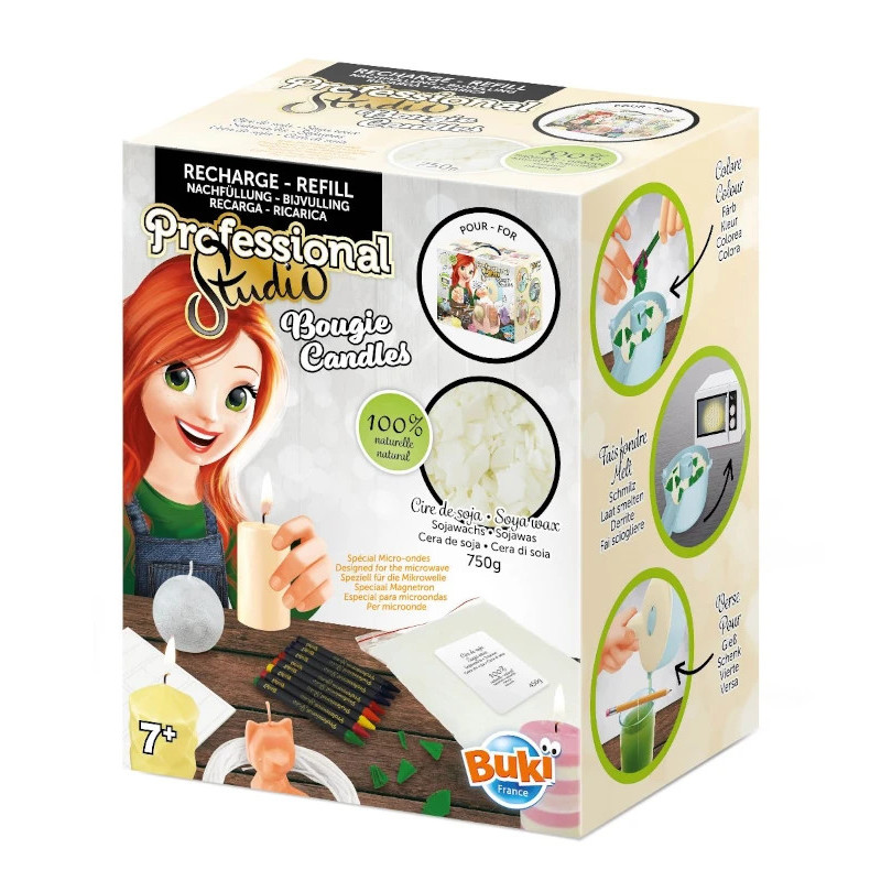 Náhradní vosk pro výrobu svíček k sadě BUKI Velká výroba svíček Profesionální studio, případně k jiným sadám pro výrobu svíček. 100% přírodní sójový vosk. Součástí náhradní sady jsou i knoty s držáky a 8ks barevných voskovek.