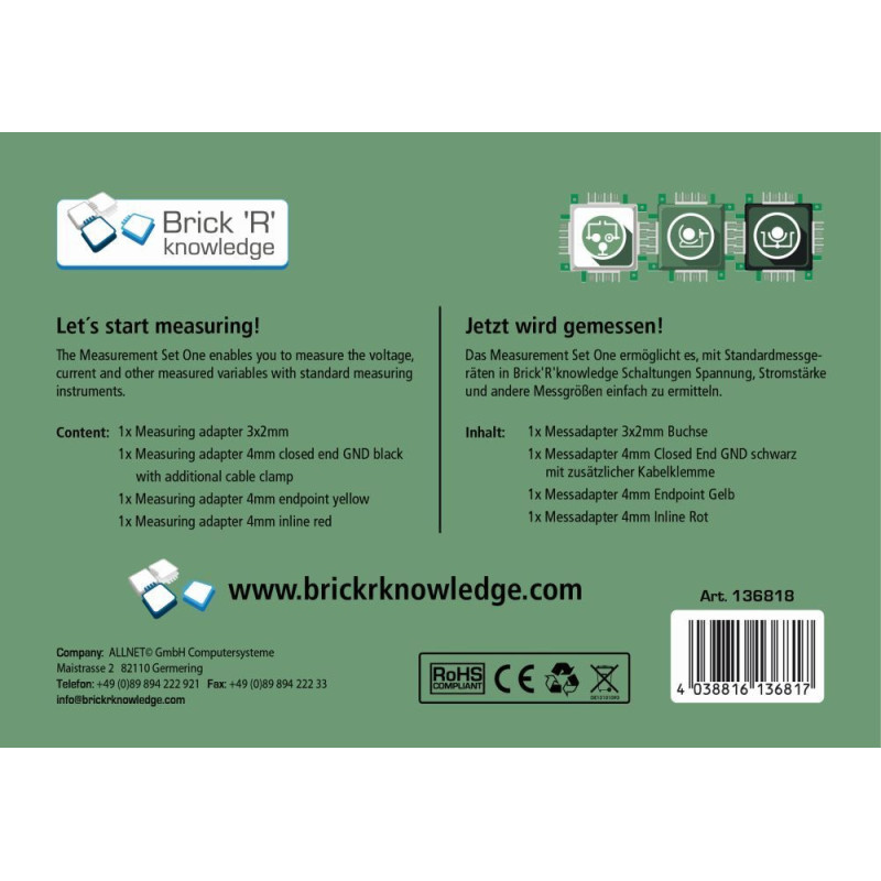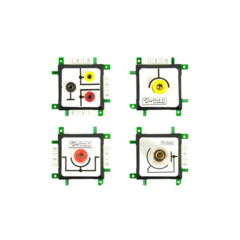Sada Measurement Set One obsahuje 4 specializované adaptéry, díky kterým snadno připojíte laboratorní multimetr, banánky nebo měřicí kabely ke svému Brick’R’knowledge obvodu. Ideální pro školy i domácí dílny, které chtějí využít reálné měřicí přístroje při výuce elektroniky.