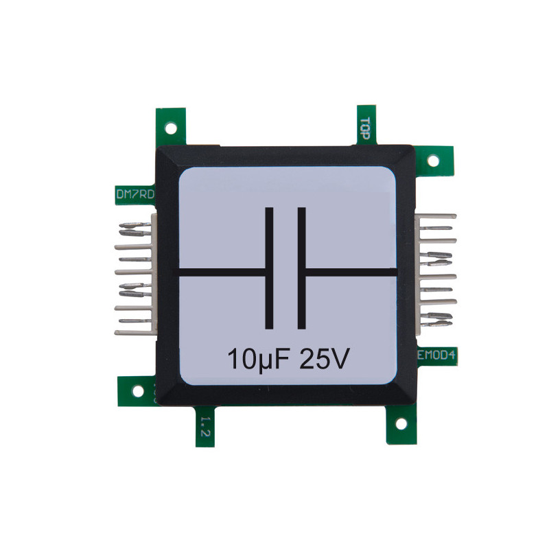 Tento kondenzátor má kapacitu 10µF. Může tedy uchovávat desettisíckrát více elektrické energie než varianta 1nF. Nabíjecího napětí 1 V je proto dosaženo již po 10 µs, pokud je nabíjen proudem 1 A. Kondenzátor nesmí překročit své maximální napětí 25 V!