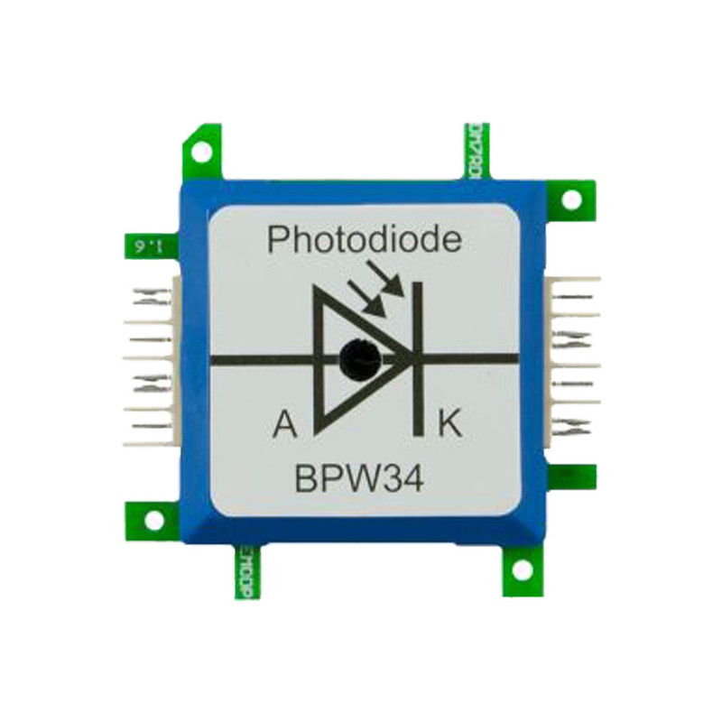 Tato kostka je fotodioda. Věnujte zde zvláštní pozornost polaritě! Stejně jako ostatní diody vedou fotodiody proud pouze v přímém směru. Abyste je však mohli použít jako světelné senzory, musí být do obvodu vloženy v opačném směru. V takovém případě se při vystavení světlu stanou vodivými. Za tímto účelem musí být anoda připojena k zápornému pólu zdroje napětí a katoda k jeho kladnému pólu.