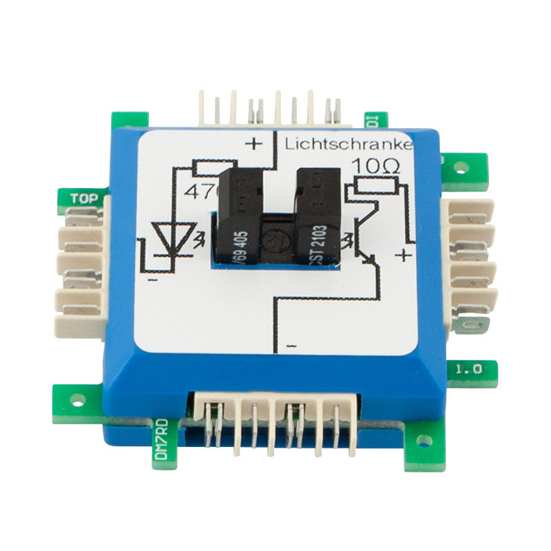 Tato kostka obsahuje světelnou závoru. Funguje tak, že LED dioda osvětluje fototranzistor. Pokud je optické spojení mezi LED a fototranzistorem přerušeno, tranzistor se zablokuje. Světelné závory se používají například v zabezpečovacích systémech nebo v průmyslu jako inkrementální senzory. Protože přenos signálu je výhradně optický, lze informace přenášet elektricky izolovaně a bez mechanického opotřebení z jednoho obvodu do druhého.