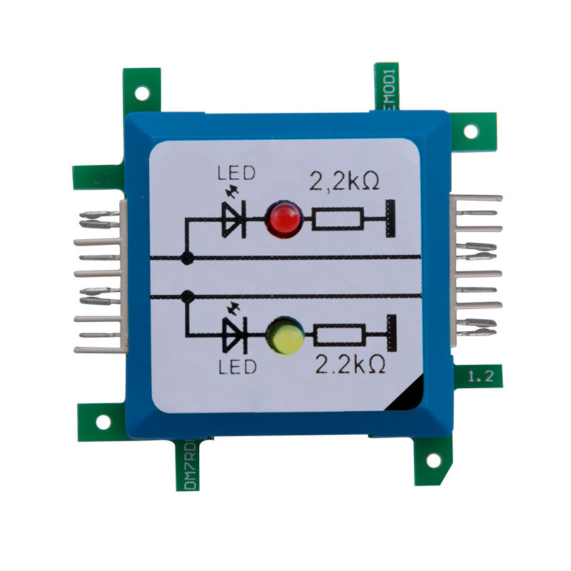 V této součásti jsou umístěny dvě LED diody (diody vyzařující světlo). Kromě toho je použit sériový rezistor 2,2KOhm, který chrání diody před nadměrným průtokem proudu. Jsou optimalizovány pro proud 2 mA. Oba rezistory jsou připojeny k zemi. To umožňuje připojit součástku přímo k výstupnímu páru Arduino Nano Brick. Kromě toho jsou oba signály předány na druhý konec, takže tam lze provádět další ovládání.