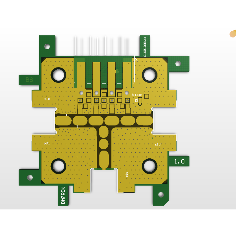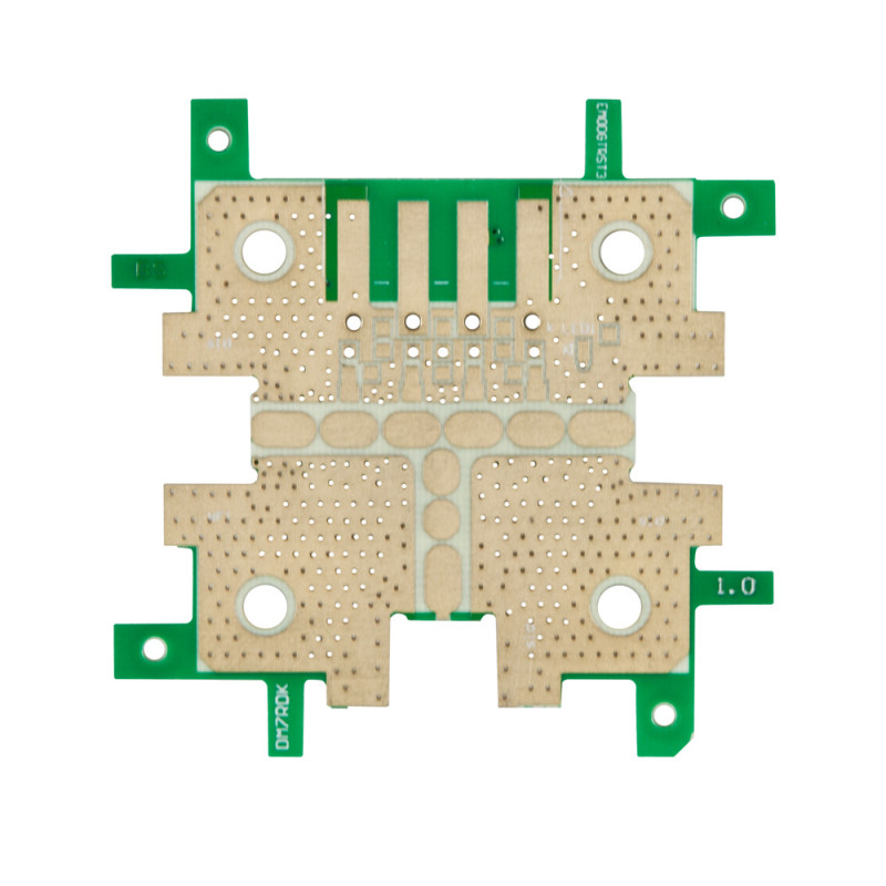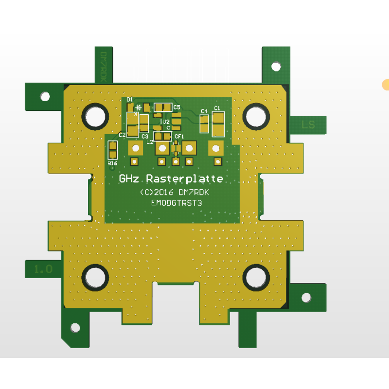 Struktura rozbočovače, slučovače, filtrů, směšovače. Volitelný regulátor napětí na spodní straně. Konektor P-SMP na obou stranách od firmy Rosenberger. Alternativně /SMA/RPC292. Materiál desky plošných spojů RO4350, tloušťka 1,55 mm. Dráhy jsou navrženy pro 50 Ohm podle mikropásků. Přemostění pomocí rezistorů SMD 0805 0R.