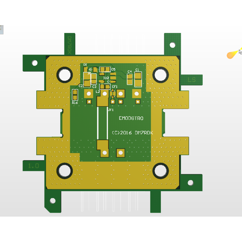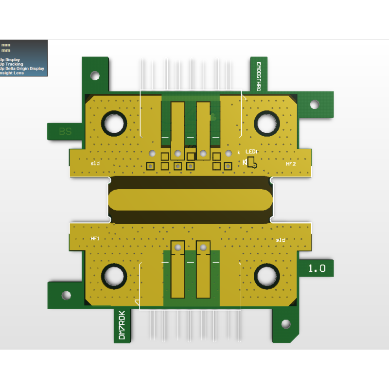 Struktura konektorů, adaptérů, zkreslených přívodů. Volitelný regulátor napětí na spodní straně. Konektory P-SMP a nebo SMA na obou stranách od firmy Rosenberger. Alternativně /SMA/RPC292. Materiál desky plošných spojů RO4350, tloušťka 1,55 mm. Dráhy jsou navrženy pro 50 Ohm podle mikropásků. Přemostění pomocí rezistorů SMD 0805 0R.